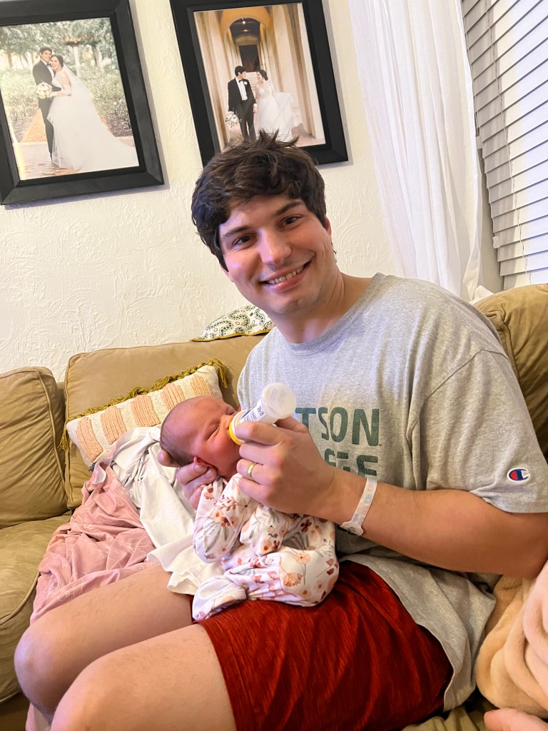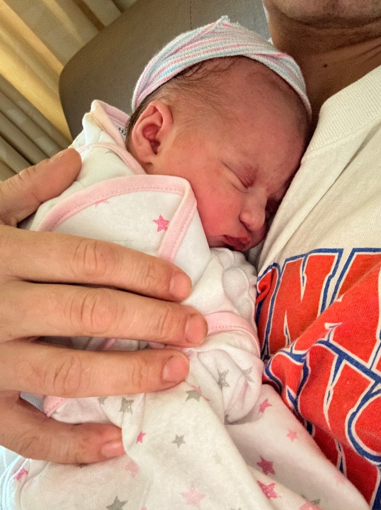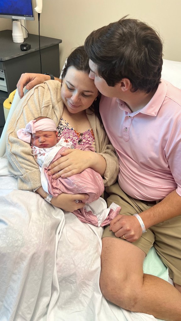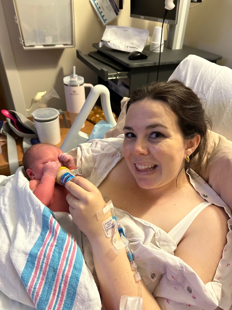 Charlotte Leigh Giovenco was born at 4:59 pm on April 6th, 2023, weighing six pounds and eleven ounces and nineteen and a half inches long. They stitched me up while Lottie lay on my chest and then Matt held her for the first time (swoon!). Shortly after my mom and sister came in the room and then Matt’s mom and then his dad. I didn’t know it at the time, but my MIL took videos of Lottie just laying on me and recorded some really sweet moments and conversations. That isn’t something I would have thought to ask for, but now it is one of my favorite things! Everything was such a blur, and it is really special to watch back some of those first few moments as a mom.