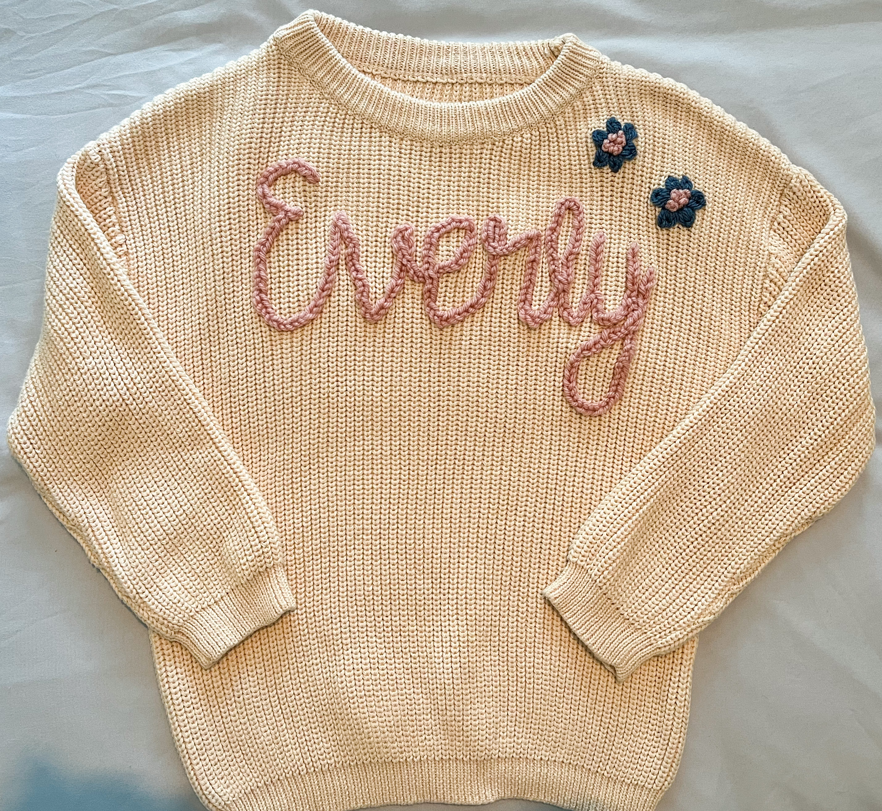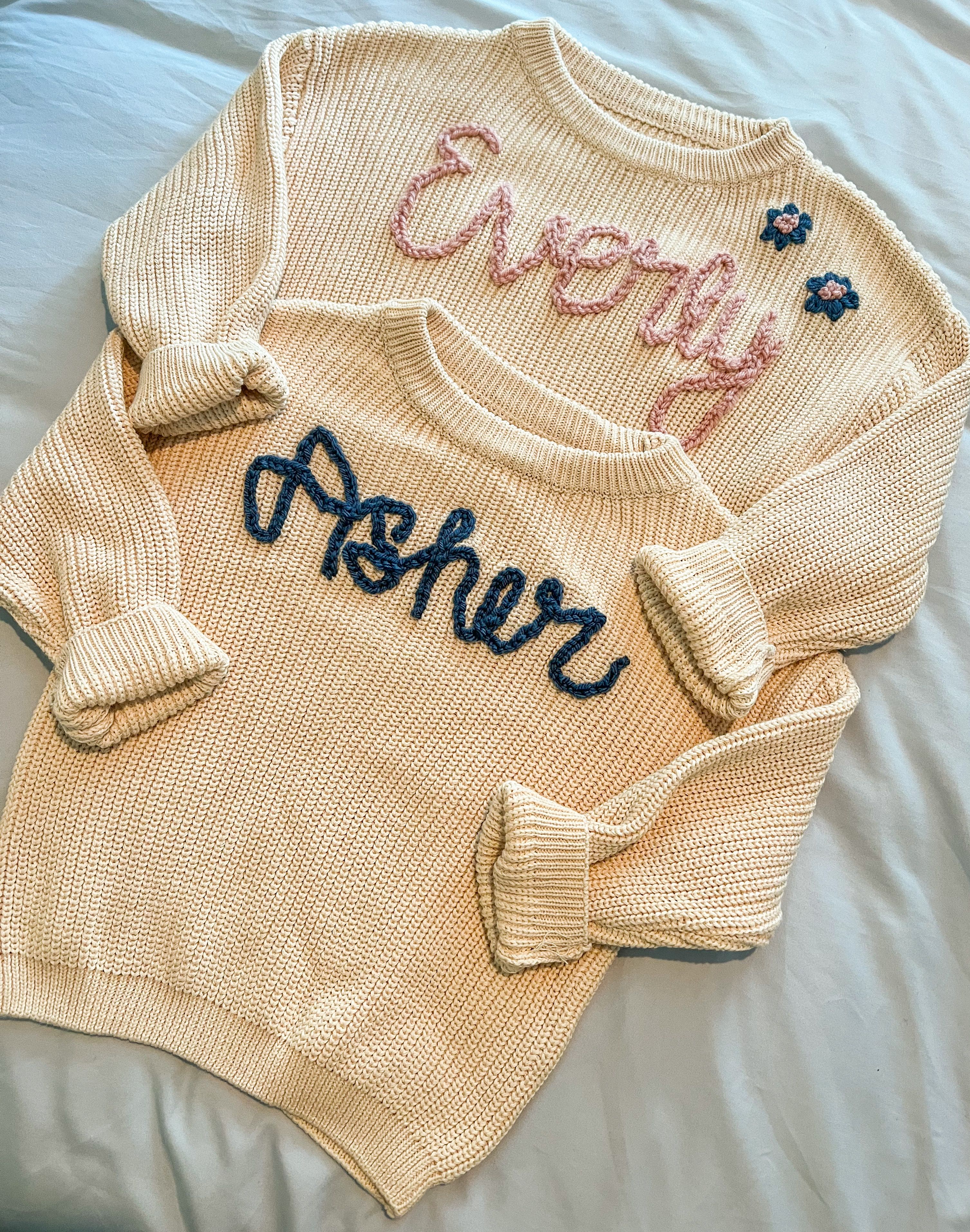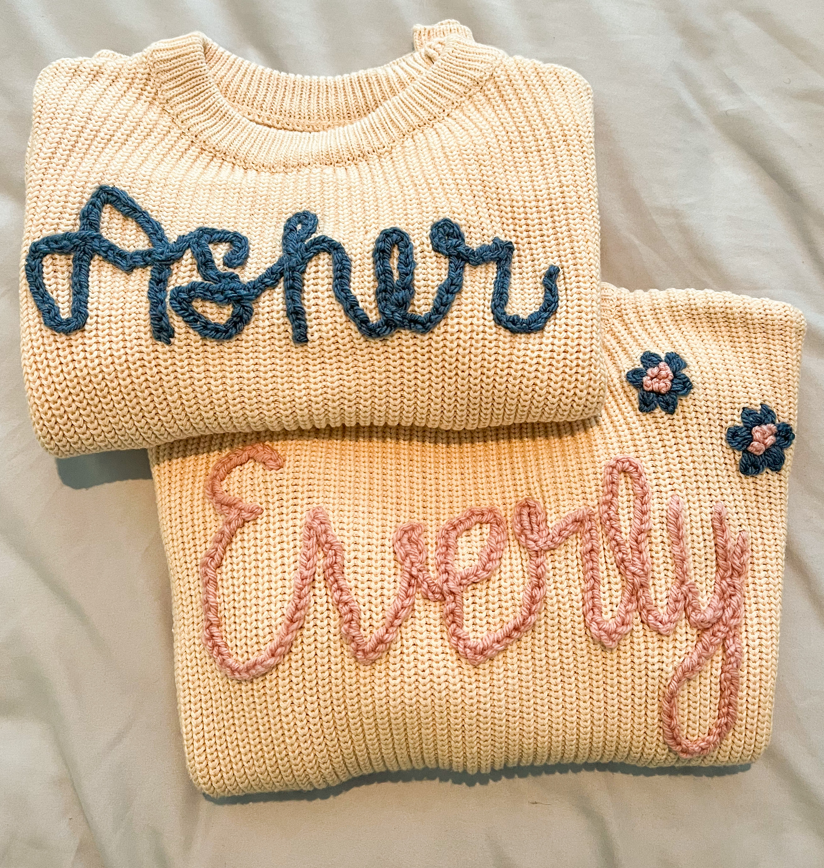 These sweaters were a custom order for a big sister, little brother duo. I love how they are coordinating but not exactly matching. The flowers on the female sweater are a fun custom touch.