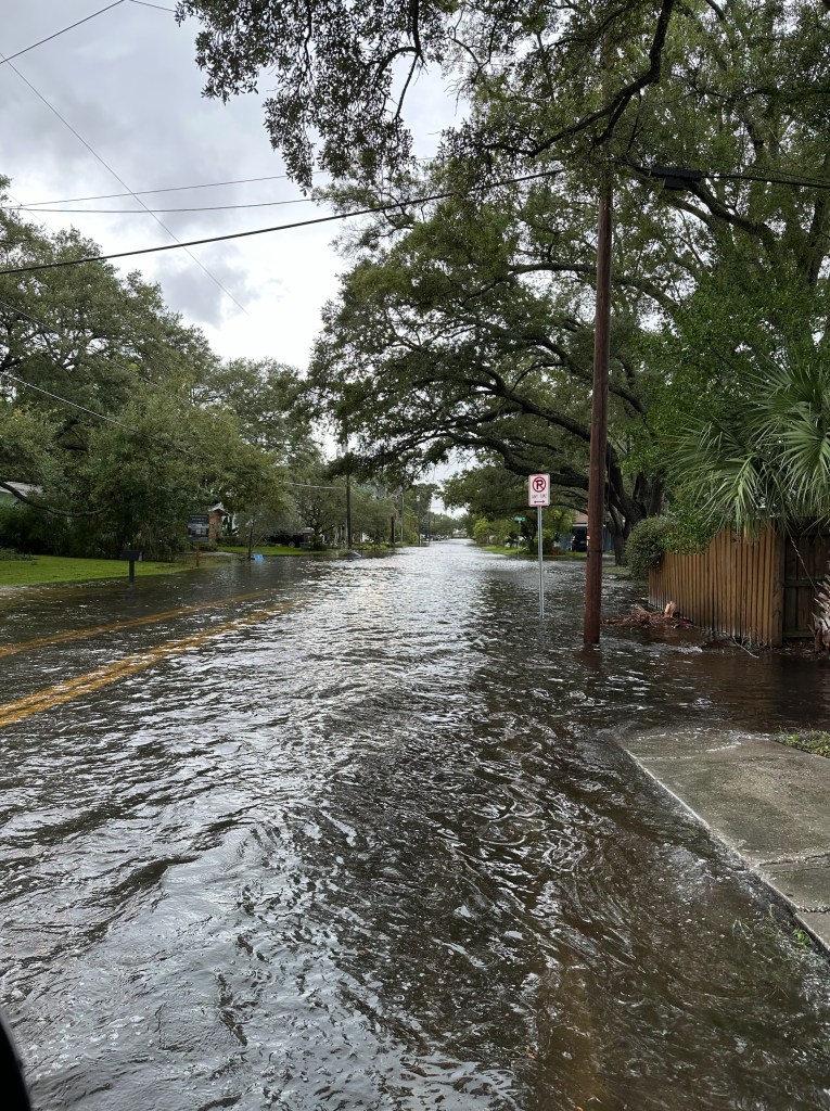 Monday night Matt put out our sandbags and loaded items in our carport onto the back porch and into the shed. We went back and forth all day trying to decide whether to stay at Matt’s parent’s house last night or at ours. Our house is very close to the bay and on low ground. His parent’s house is more inland and on higher ground. After dinner, we made the choice to just play it safe and bunk up with them. Matt went back to check on our house and this is the street leading up to our neighborhood! But our house is a couple of feet off of the street and was completely fine! We are so grateful for the Lord’s protection over us and over our house.