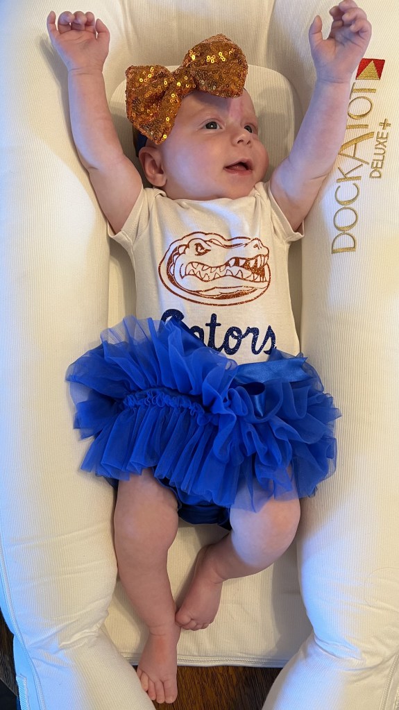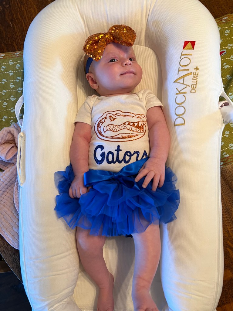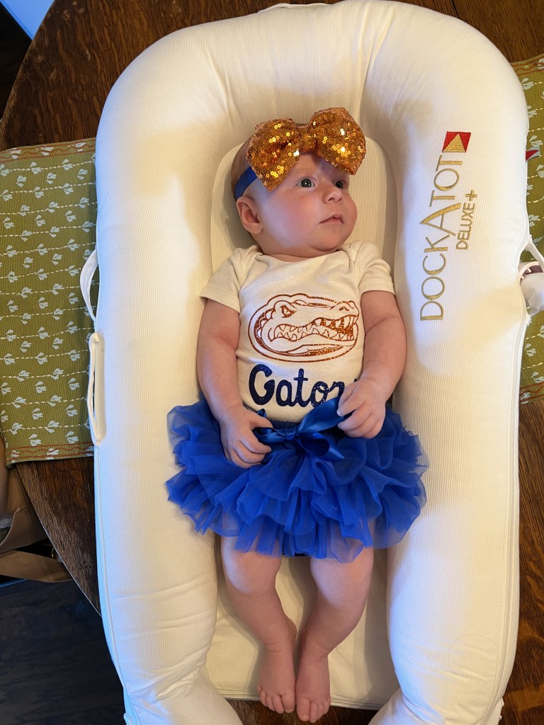 Before Lottie was born, we received quite a few Gator outfits and toys. Lottie wore this outfit when the Gators were playing in the College World Series.