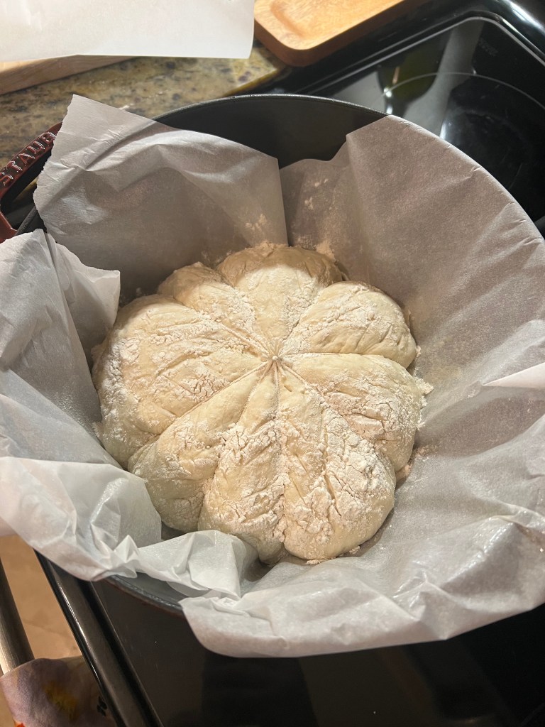 Take a large sheet of parchment paper and set it on the Dutch oven. Then place your dough right on top. Cover it again with the plastic wrap and set a timer for about thirty minutes. Pre heat your oven to 450 degrees. I like to set my dutch oven on top of my oven as it helps it rise even more. After your time is up, take off the plastic wrap and put the lid on the pot. Place the bread in the oven and set another thirty minute timer. After thirty minutes remove the lid and lower the oven temperature to 400 degrees and wait fifteen minutes.